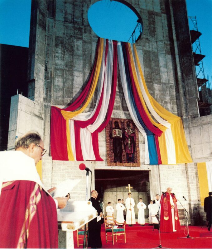 Následne pápež zaintonoval počiatočné zvolanie posviacky: „Požehnaný Boh náš…“ a nasledovala séria prosieb, ktoré prednášal o. diakon George Bubanko. Záverečnú doxológiu predniesol vladyka M.Rusnák, CSsR. Potom pápež pristúpil k stavbe, vykonal obrad posviacky základného kameňa a reliéfov na priečelí, ktoré znázorňujú sv. Cyrila a Metóda a Jána Pavla II. svätiaceho katedrálu. Päť miništrantov viedlo procesiu Svätého Otca, ktorého po ľavici sprevádzal vladyka M.Rusnák CSsR a po pravici ukrajinský biskup Izidor Borecký. Za nimi šiel diakon Bubanko a zbor zatiaľ spieval po slovensky „Bože ráč zhliadnuť na slovenský ľud.“ Na mieste budúceho prestola posvätil a podpísal sedem antimenziónov.