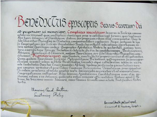 V priebehu storočí vznikali v Cirkvi viaceré spoločenstvá, ktoré sa vyznačovali mnohorakými a rozmanitými vonkajšími prejavmi, a my ich chceme ako legitímne spoločenstvá chrániť, aby dosiahli väčší rozkvet v rámci vlastného rítu. Teraz sa zaoberáme úvahami o veriacich byzantského rítu, ktorí žijú na Slovensku. Hneď potom, ako o tejto veci referoval prefekt Kongregácie pre východné cirkvi, sme teda dospeli k rozhodnutiu, že je vhodné založiť na Slovensku novú eparchiu. Preto sme na základe našej apoštolskej autority vyňali určité územie spod jurisdikcie prešovského biskupa, a to konkrétne dekanáty Bratislavský, Nitriansky, Banskobystrický a Žilinský, a pre veriacich byzantského rítu ustanovujeme novú eparchiu, ktorá sa má volať Bratislavská, pričom jej udeľujeme všetky náležité práva a povinnosti. Pravda, túto Bratislavskú eparchu zriaďujeme ako sufragánnu Prešovskej metropolitnej cirkvi, okrem toho stanovujeme za jej eparchiálne sídlo mesto Bratislava a za katedrálne sídlo svätý chrám Povýšenia svätého Kríža. Pri uskutočnení týchto rozhodnutí nech sa zachovajú zvyklosti a náležité práva i zásady,, ktoré predpisuje Kódex kánonov východných cirkví. Okrem toho nech sa napíšu zvyčajné dokumenty o úplnej realizácii tejto úlohy a pošlú sa spomenutej kongregácii. Napokon chceme, aby táto apoštolská konštitúcia ostala právoplatná teraz i v budúcnosti; akékoľvek iné veci týmto strácajú platnosť.
