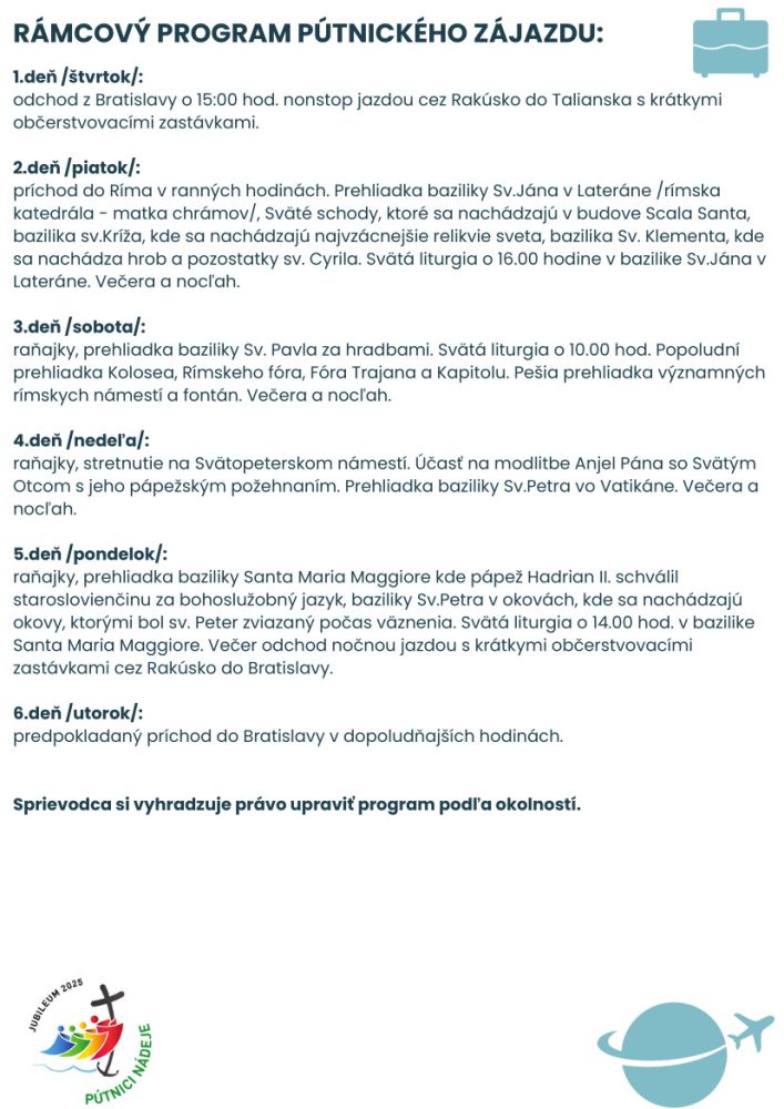 raňajky, prehliadka Baziliky Santa Maria Maggiore kde pápež Hadrián II. schválil staroslovienčinu za bohoslužobný jazyk, Baziliky sv. Petra v okovách, kde sa nachádzajú okovy, ktorými bol sv. Peter spútaný počas väznenia. Svätá liturgia o 14.00 hod. v bazilike Santa Maria Maggiore. Večer odchod nočnou jazdou s krátkymi občerstvovacími zastávkami cez Rakúsko do Bratislavy.
