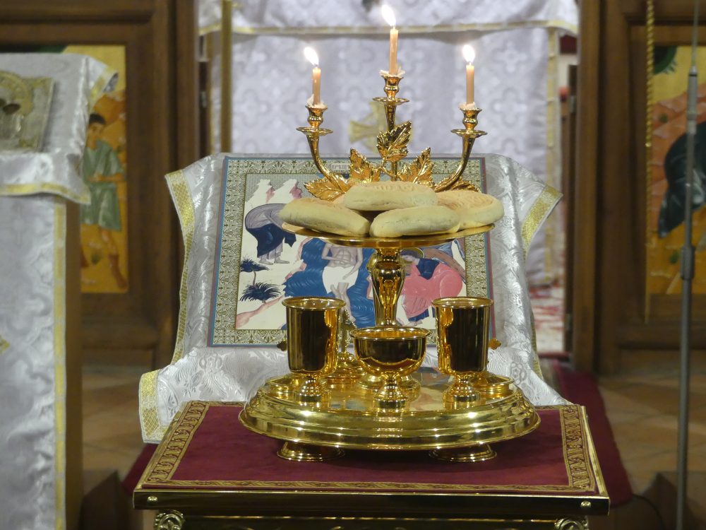 Vladyka Milan následne posvätenou vodou pokropil celý chrám, počnúc svätyňou i všetkých prítomných. Veriaci si mohli nabrať posvätenú vodu, napiť sa z nej a odniesť si ju do svojich príbytkov.