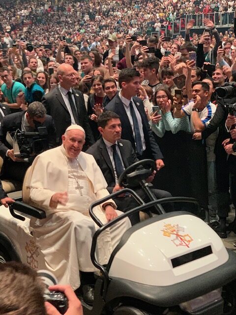 Po krátkej prezentácii ľudového tanca svedčili niekoľkí mladí ľudia o svojej viere pred pápežom. Všetky ich svedectvá nadšene privítalo 11 000 účastníkov, ktorí zaplnili arénu, pričom ich slová niekoľkokrát prerušili potleskom.