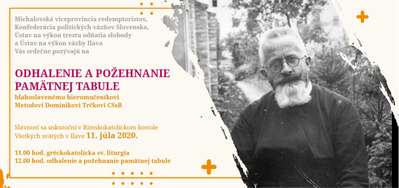 Michalovská viceprovincia redemptoristov, Konfederácia politických väzňov Slovenska, Ústav na výkon trestu odňatia slobody a Ústav na výkon väzby Ilava vás srdečne pozývajú na slávnosť odhalenia a požehnania pamätnej tabule blahoslavenému hieromučeníkovi Metodovi Dominikovi Trčkovi CSsR, ktorá sa bude konať v rímskokatolíckom Kostole všetkých svätých v Ilave v sobotu 11. júla 2020.
