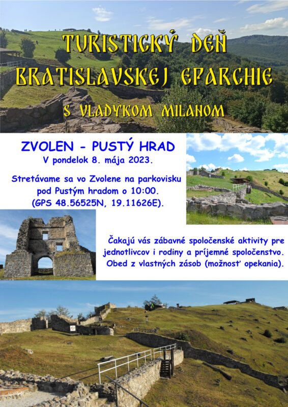 Bratislavská eparchia pozýva na celoeparchiálny turistický deň s vladykom Milanom Lachom, ktorý sa uskutoční v pondelok 8. mája 2023. Miesto stretnutia bude vo Zvolene na parkovisku pod Pustým hradom o 10:00 hod. Cieľom bude Pustý hrad Zvolen.