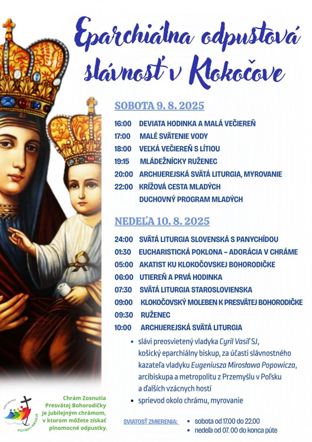 Košická eparchia srdečne pozýva pútnikov a mariánskych ctiteľov na najväčšiu odpustovú slávnosť Košickej eparchie do Klokočova. Slávnosť sa uskutoční počas víkendu 9. – 10. augusta. Počas týždňa sa farnosť na odpust pripravuje duchovnou obnovou, v utorok 5. augusta sa na pešiu púť s Klokočovskou ikonou vydali aj mladí spolu s vladykom Cyrilom a vladykom Jonášom.