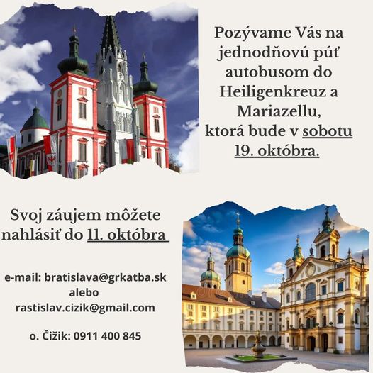 Gréckokatolícka farnosť Povýšenia svätého Kríža Bratislava-Staré Mesto pozývame vás na jednodňovú púť autobusom do Heiligenkreuz a Mariazell (Rakúsko).