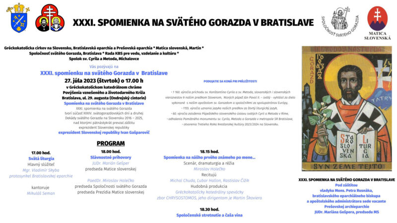 Vo štvrtok 27. júla 2023, na sviatok Svätých sedmopočetníkov (sv. Cyrila, Metoda, Gorazda, Klimenta, Nauma, Sávu a Angelára) sa v Katedrálnom chráme Povýšenia svätého Kríža uskutoční podujatie – XXXI. Spomienka na svätého Gorazda v Bratislave. Organizátormi podujatia sú: Gréckokatolícka cirkev – Bratislavská eparchia; Matica slovenská, Martin; Spoločnosť svätého Gorazda; Rada KBS pre vedu, vzdelanie a kultúru; Spolok sv. Cyrila a Metoda, Michalovce.