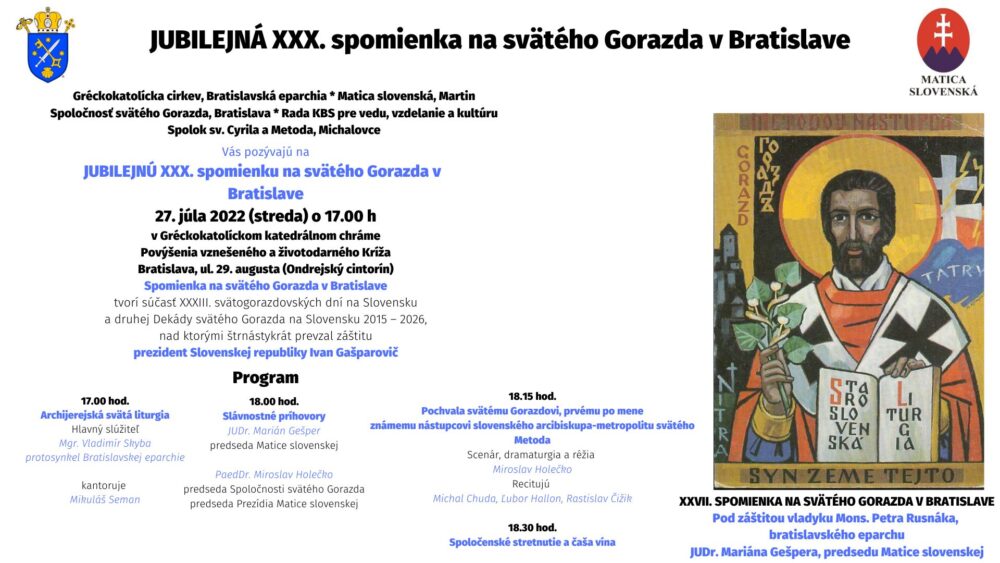 V stredu, 27. júla 2022, na sviatok Svätých sedmopočetníkov (Cyrila, Metoda, Gorazda, Klimenta, Nauma, Sávu a Angelára) sa v Katedrálnom chráme Povýšenia svätého Kríža uskutoční jubilejná XXX. Spomienka na svätého Gorazda v hlavnom meste SR Bratislave. Hlavným organizátorom podujatia je Spoločnosť svätého Gorazda.