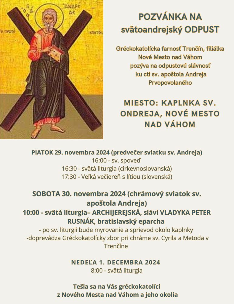 Gréckokatolícka farnosť Trenčín, filiálka Nové Mesto nad Váhom pozýva na odpustovú slávnosť ku cti sv. apoštola Andreja Prvopovolaného, ktorá sa bude konať v Kaplnke sv. Ondreja v Novom Meste nad Váhom.