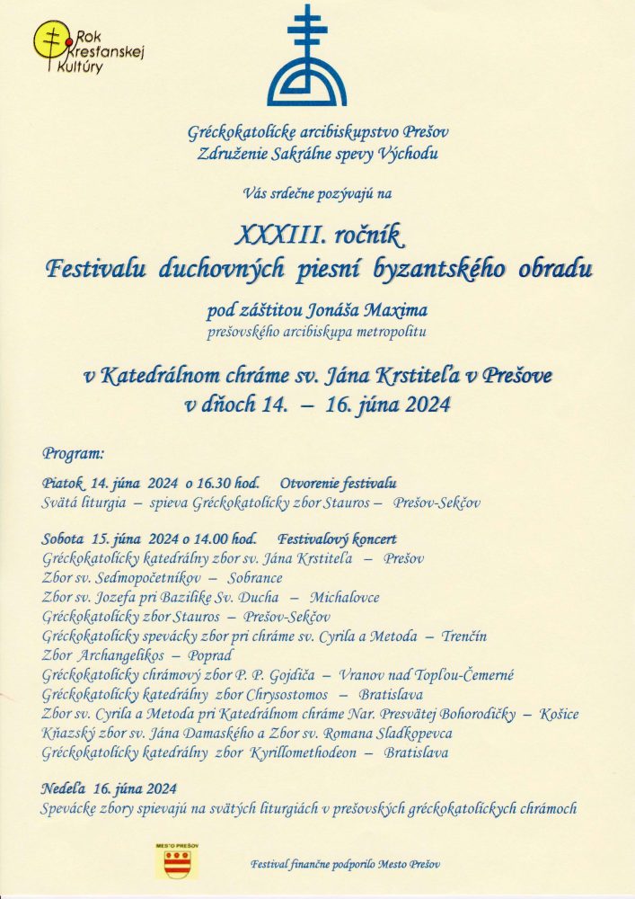 Gréckokatolícke arcibiskupstvo Prešov a Združenie Sakrálne spevy Východu pozývajú na XXXIII. ročník Festivalu duchovných piesní byzantského obradu, ktorý sa uskutoční v prešovskom Gréckokatolíckom katedrálnom chráme sv. Jána Krstiteľa v dňoch 14. -16.júna 2024 pod záštitou Jonáša Maxima, prešovského arcibiskupa metropolitu.