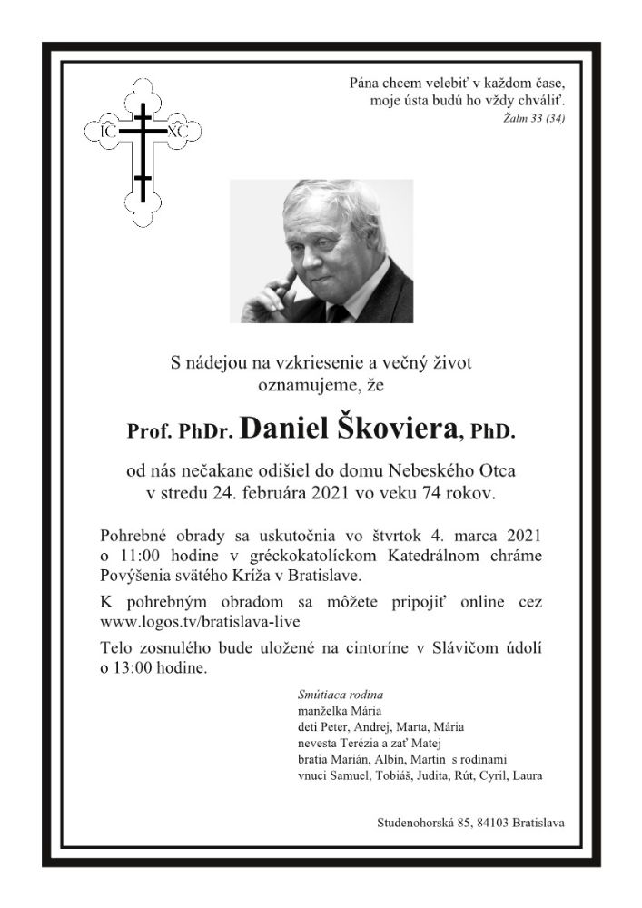 S hlbokým zármutkom v srdci a s nádejou na Božie milosrdenstvo oznamujeme, že v utorok 24. februára 2021 v ranných hodinách náhle zosnul v Pánovi dlhoročný kantor farnosti Bratislava-Staré Mesto, prof. Daniel Škoviera vo veku 74 rokov. Jeho úmrtie nebolo spôsobené ochorením Covid-19.