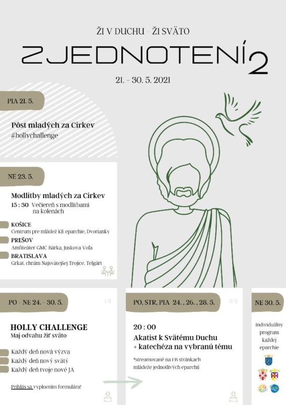 Rada pre mládež Košickej eparchie, Prešovskej archieparchie a Bratislavskej eparchie pozývajú mladých prežiť Svätodušné sviatky prostredníctvom duchovnej výzvy Zjednotení – maj odvahu žiť sväto. Výzva trvá od 21. do 30 mája sa pozostáva z rôznych úloh, modlitieb, katechéz a stretnutí, vďaka ktorým môžu priniesť mladí viac svätosti do svojho každodenného života. Všetky informácie a prihlasovací formulár nájdete na facebookovej stránke: Mládež Bratislavskej eparchie .
