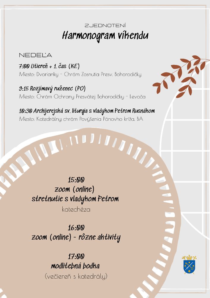 Podujatie vyvrcholí v nedeľu sv. liturgiami s vladykmi jednotlivých eparchií a bude pokračovať následnými popoludňajšími alebo večernými on-line aktivitami, ktoré si už pripravili jednotlivé eparchie osobitne.